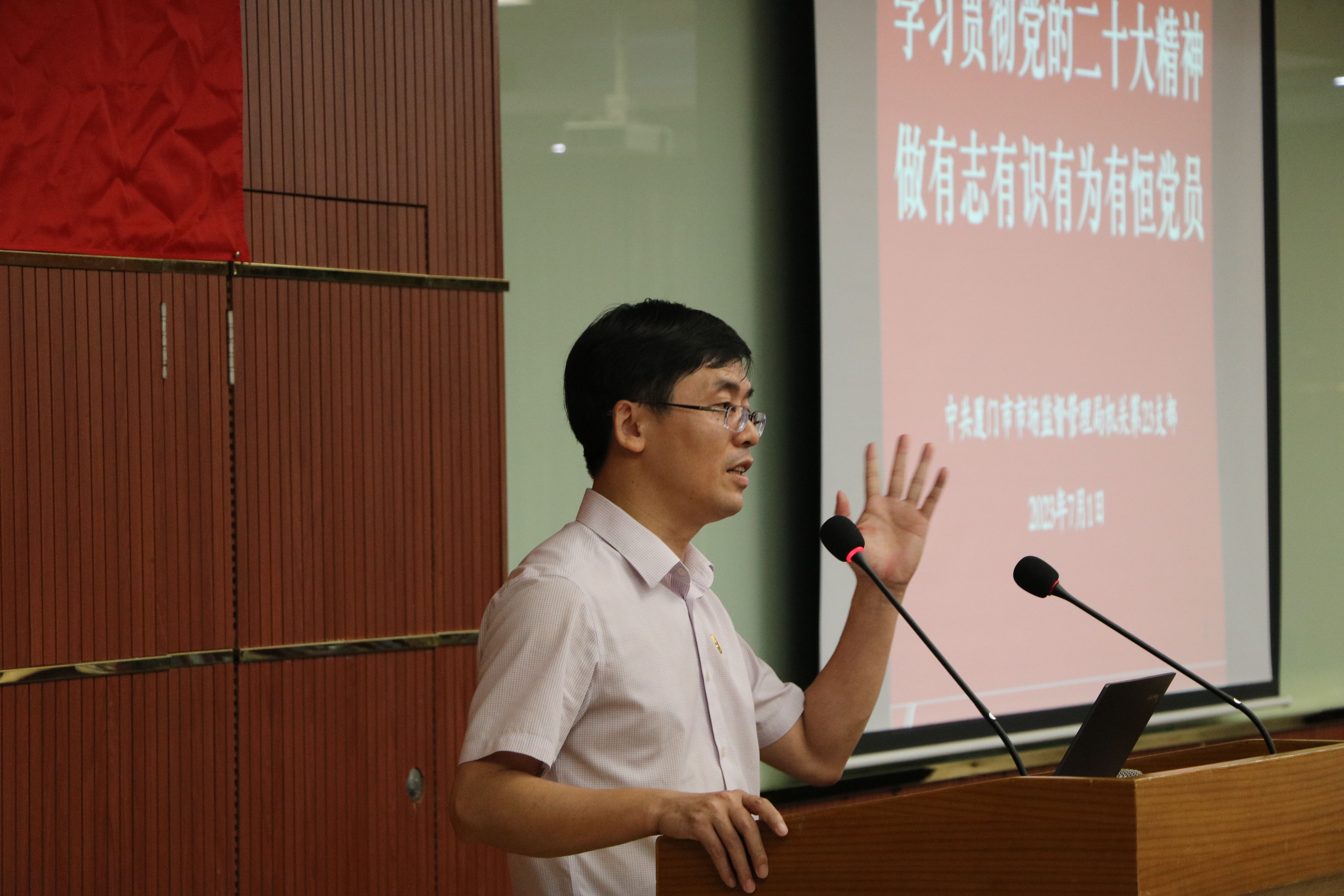 在這次聯(lián)建共建中,中共廈門市市場監(jiān)督管理局機關第二十三支部何清杭書記帶來了一堂《學習貫徹黨的二十大精神,做有志有識有為有恒黨員》的主題黨課。授課前,何書記作為領誓員,脫稿帶領大家一起重溫入黨誓詞,全體黨員面對鮮紅的黨旗,莊嚴地舉起右拳,鏗鏘有力、擲地有聲地宣讀誓詞。