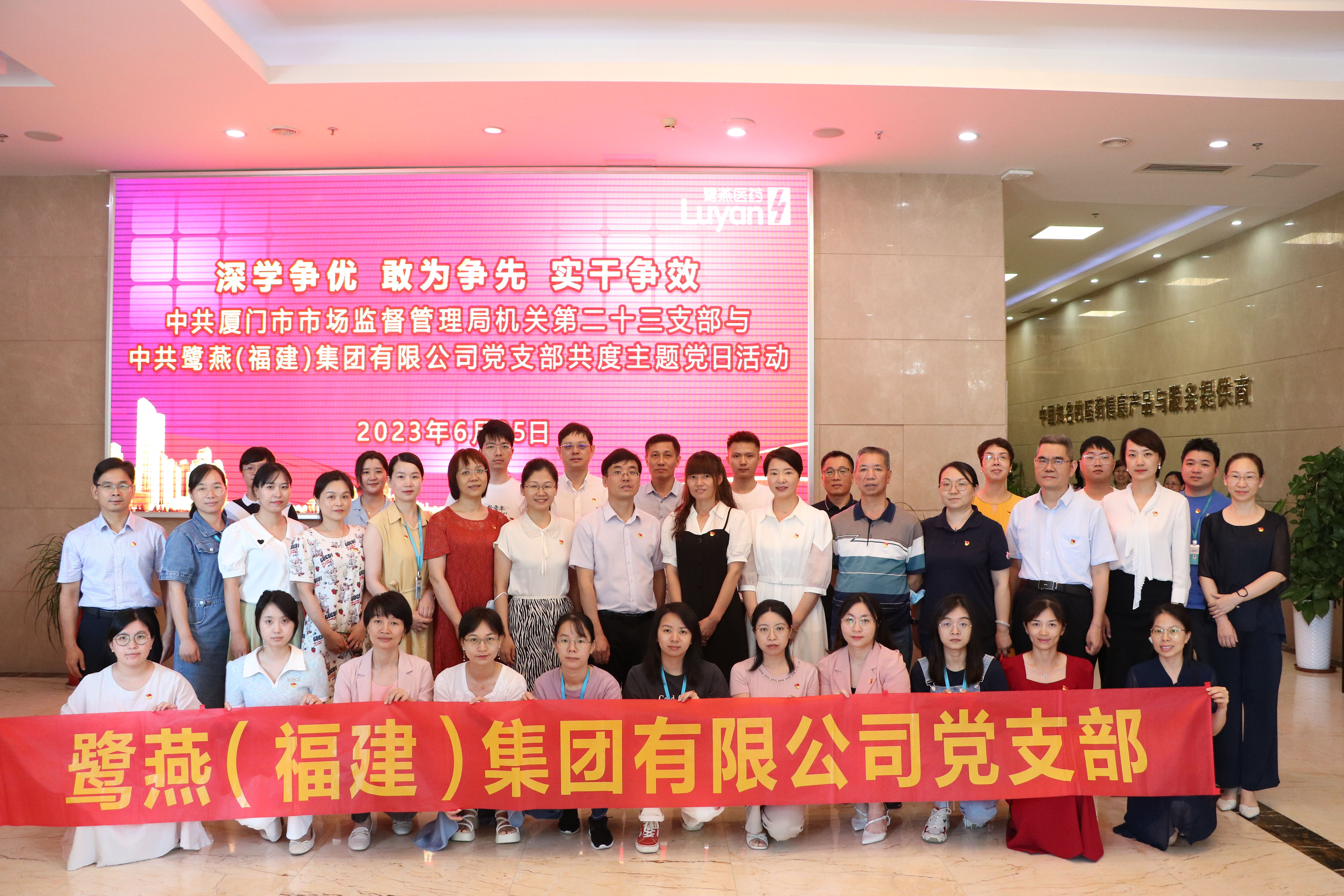 為深入學習貫徹黨的二十大精神,慶祝中國共產(chǎn)黨成立102周年,充分發(fā)揮黨建工作對企業(yè)經(jīng)營管理的引領力,鷺燕(福建)集團有限公司黨支部積極主動對接監(jiān)管部門基層黨支部,與中共廈門市市場監(jiān)督管理局機關第二十三支部共同開展主題黨日活動。2023 年6月25日, 活動在鷺燕總部大廈如期舉行,中共廈門市市場監(jiān)督管理局機關第二十三支部全體黨員、鷺燕(福建)集團有限公司黨支部黨員以及鷺燕集團廈門區(qū)域部分成員公司總經(jīng)理、質(zhì)管干部參加了活動。