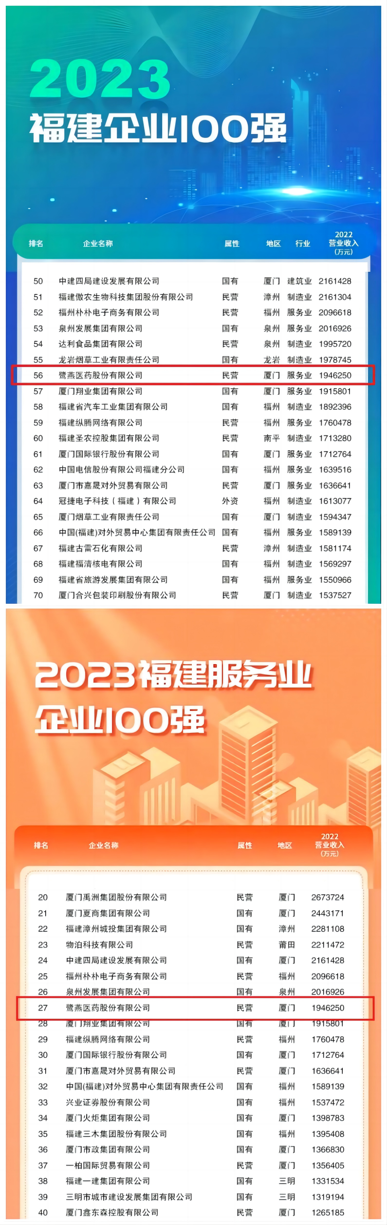鷺燕醫(yī)藥股份有限公司本次榮登《2023福建企業(yè)100強》榜單第56位、在《福建服務(wù)業(yè)企業(yè)100強》排名第27位!