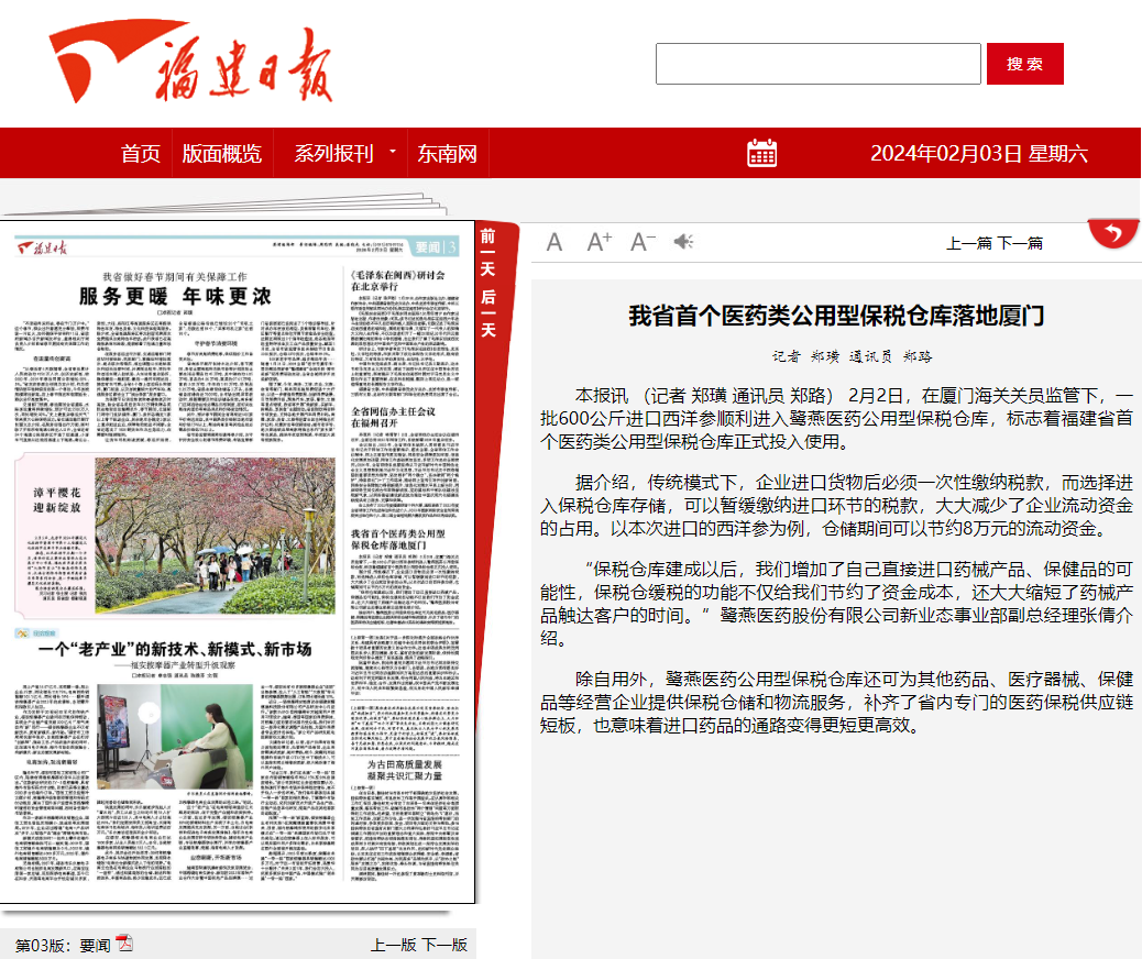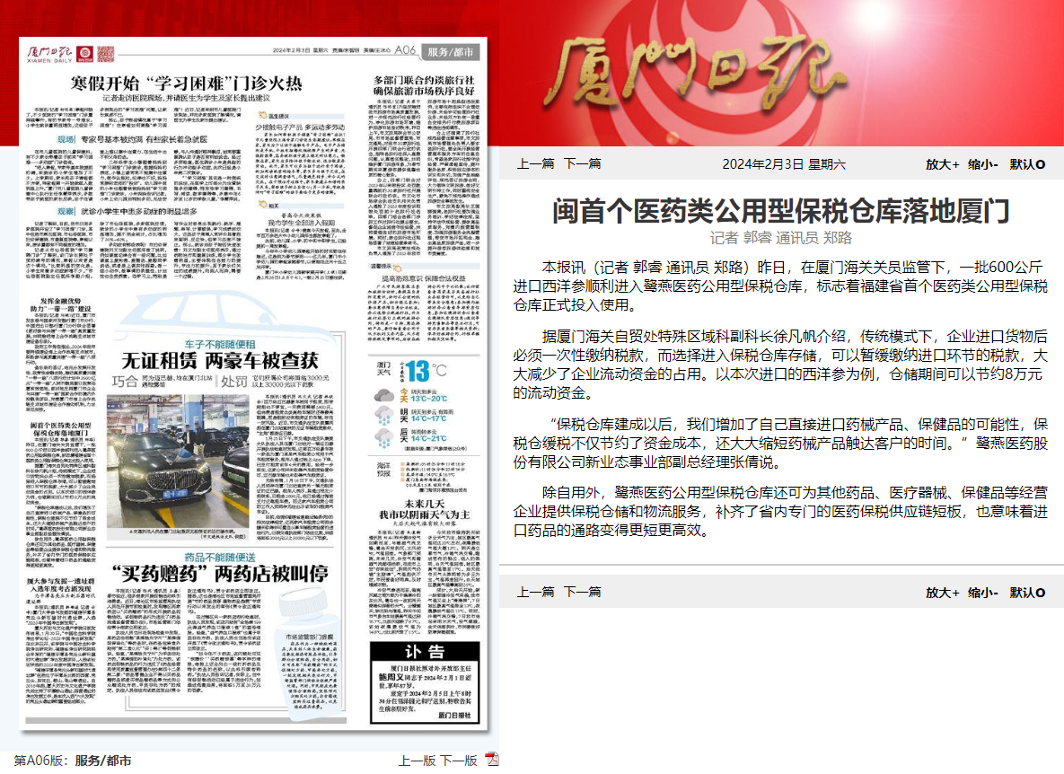 2024年2月2日,鷺燕醫(yī)藥公用型保稅倉(cāng)獲批投用,《福建日?qǐng)?bào)》《廈門(mén)日?qǐng)?bào)》相繼報(bào)道相關(guān)新聞。鷺燕醫(yī)藥公用型保稅倉(cāng)是福建省首個(gè)醫(yī)藥類公用型保稅倉(cāng)庫(kù),該保稅倉(cāng)庫(kù)的投用,意味著廈門(mén)市乃至福建省補(bǔ)齊了區(qū)域內(nèi)專門(mén)的醫(yī)藥保稅供應(yīng)鏈物流服務(wù),也意味著廈門(mén)和福建進(jìn)口藥品的通路變得更短,更為高效。