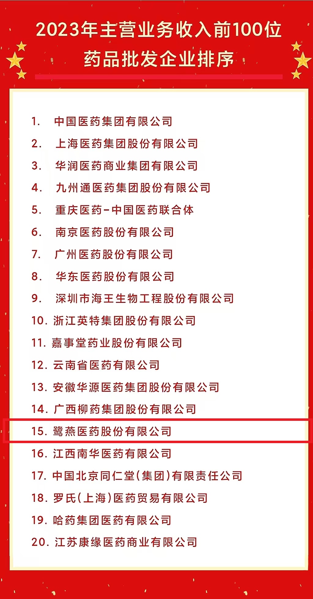 鷺燕醫(yī)藥榮登2023年藥品批發(fā)企業(yè)主營業(yè)務(wù)收入第15位!