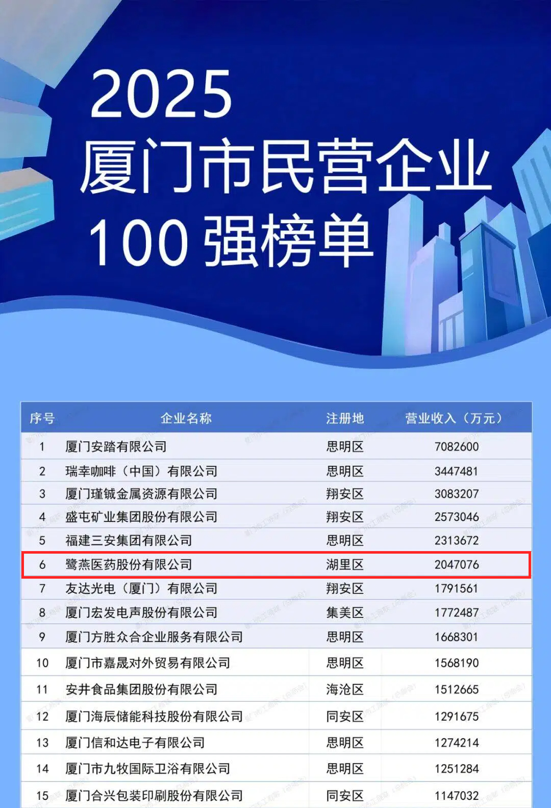 11月1日上午,2025年廈門企業(yè)家日大會(huì)召開。大會(huì)發(fā)布了2025廈門市民營企業(yè)100強(qiáng)系列榜單,介紹了廈門市民營經(jīng)濟(jì)發(fā)展態(tài)勢和營商環(huán)境建設(shè)成效。鷺燕醫(yī)藥股份有限公司憑借上市企業(yè)綜合實(shí)力,榮膺“2025廈門市民營企業(yè)100強(qiáng)”第6位,以及“2025廈門市民營企業(yè)服務(wù)業(yè)50強(qiáng)”第4位。