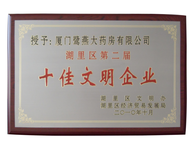 廈門(mén)鷺燕大藥房有限公司于2010年10月被廈門(mén)市湖里區(qū)文明辦、廈門(mén)市湖里區(qū)經(jīng)濟(jì)貿(mào)易發(fā)展局評(píng)為湖里區(qū)第二屆“十佳文明企業(yè)“榮譽(yù)稱號(hào)。